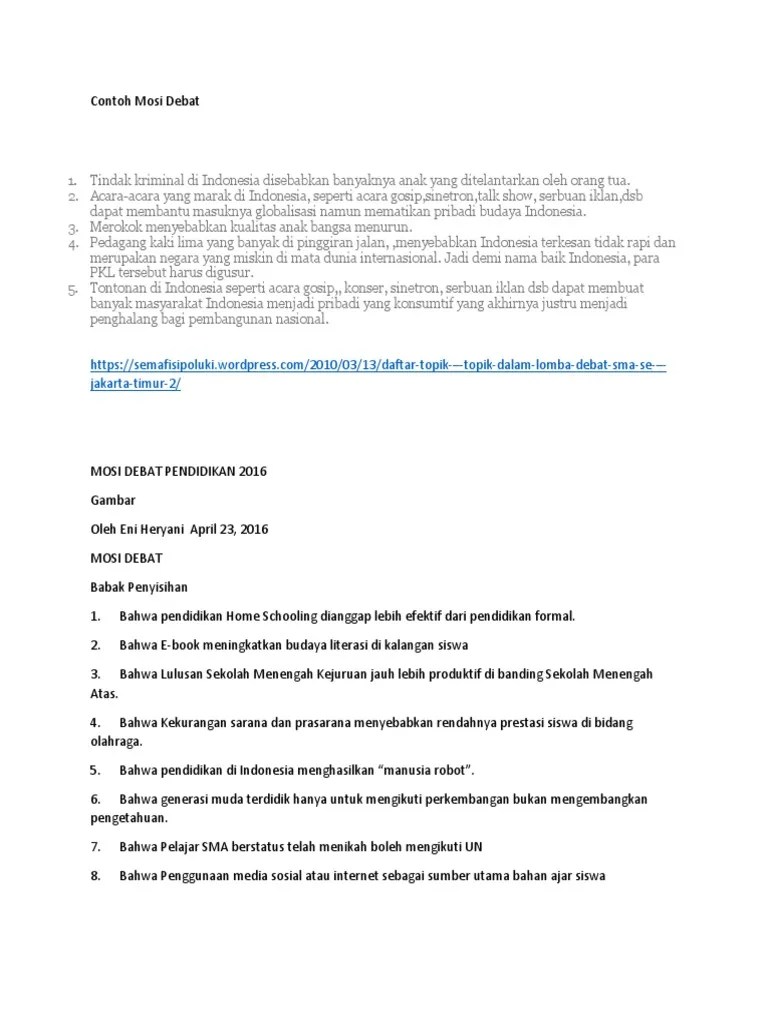 Menurut iis siti salamah azzahra dalam buku menulis teks debat (2020), mosi debat bisa diketahui dari judul ataupun pendapat yang disampaikan . Sekolah tatap muka mengundang pro kontra. Simaklah contoh teks debat berikut ini dengan judul generasi instan. Debat ini terbagi menjadi kelompok pro dan kontra di awali dengan pembukaan dan sebagainya. Himpunan mahasiswa program studi hukum fakultas hukum universitas pgri semarang mengadakan diskusi online dengan tema :